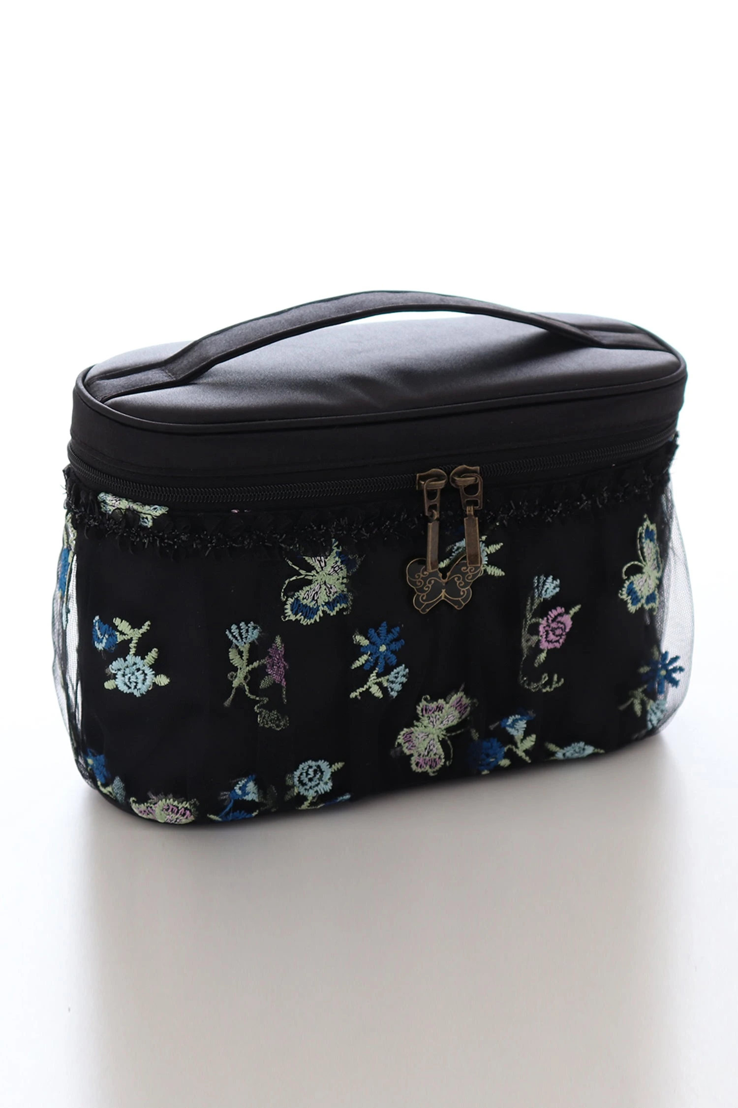 Zip around pouch with floral butterfly design and delicate lace detail
